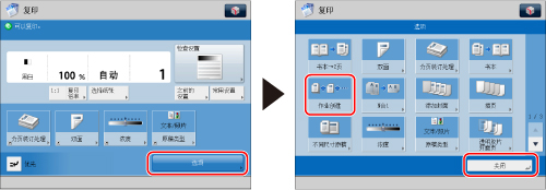 本机处于“作业创建”模式时,只能更改显示在[更改设置]中的设置。需要事先指定所需的复印设置。但是,如果同时指定[N合1]和“作业创建”模式,则无法更改[浓度]或[复印倍率]的设置。