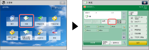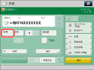 输入外部线路存取号(在上例中为“R”),按[暂停],再输入传真号码。