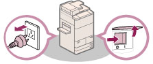 如果本机冒烟或发出异常噪音,请立即关闭主电源开关,从电源插座拔出电源线,然后致电当地的授权Canon经销商。如果在这种情况下继续使用本机,可能会导致火灾或触电事故。还应避免在电源插头附近放置物品,以便随时能够拔出本机的电源插头。