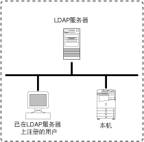 可以认证LDAP服务器中注册/管理的用户,或本机中注册的用户。登录时,用户选择要登录的位置(LDAP服务器的服务器名或[本设备])。