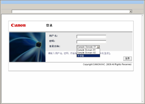 允许用户认证的域名或LDAP服务器的服务器名按字母顺序显示在“登录目标”下拉列表中。但是,无论“登录目标”下拉列表中显示的项目如何,本机所属域显示在列表的最上方,而[本设备]显示在列表的最下方。