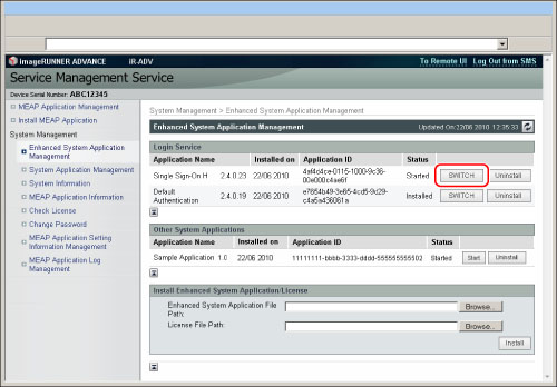 要同时使用Local Device Authentication和“部门识别码管理”,在登录服务切换到SSO-H后,更新Local Device Authentication用户数据(“部门识别码”和相应的PIN),并将[部门识别码管理]设置为“打开”。