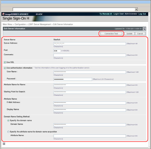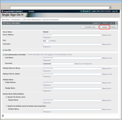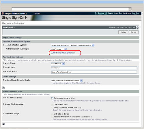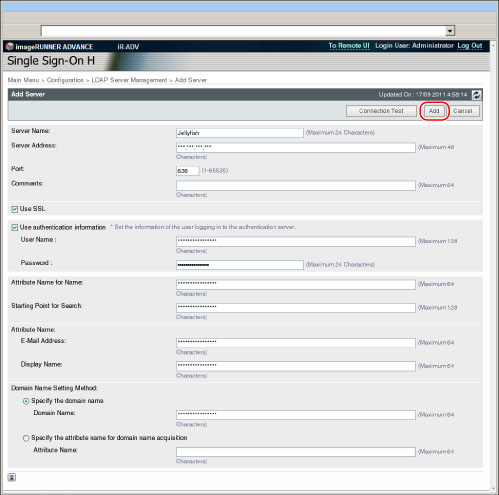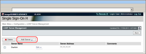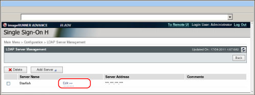 单击[LDAP Server Management](LDAP服务器管理)时,显示屏幕切换到[LDAP Server Management](LDAP服务器管理)屏幕,同时存储[Configuration](配置)中的设置。
