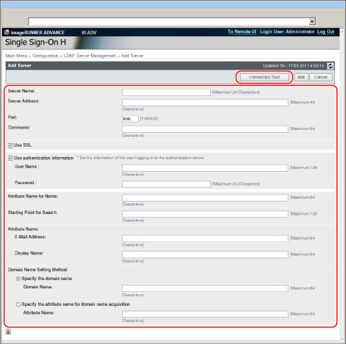 必须输入1至64个字符。不能包含空格或以下符号(\ / :* ? l < > [ ] ; , = + @ " &)。如果无法从指定属性获取域名,并且已登录用户的DN包含“dc”,则最左边的属性值设置为“LoginContext "dc" ”。如果仍然无法获取,将[Server Name](服务器名)设置的值设置为“LoginContext "dc" ”。