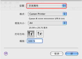 在Mac OS X 10.5或更高版本中,根据所使用的应用程序,可能不显示[页面设置]对话框。如果是这种情况,跳过步骤4。可以在[打印]对话框中指定[纸张大小]、[打印方向]和[缩放]。