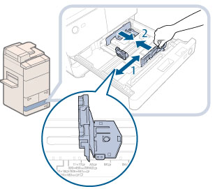 滑动这些导板直到其发出“咔哒”声。如果没有正确地对齐左导板和前导板,则触摸面板显示屏幕上将不会显示正确的纸张尺寸。此外,必须正确调整导板以免卡纸、弄脏打印件或弄脏本机内部。