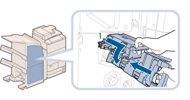 更换好装订针箱后,请务必手动复位鞍式装订处理器中的装订针。(请参阅“鞍式装订处理器装订针复位”)