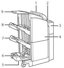 打开该盖板可以更换装订针盒、清除卡纸或清除卡针。(请参阅“更换装订针盒(对于可选产品)”和“问题解决”)
