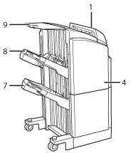 ![]() 从分页装订处理器的托盘取出纸张时,请勿将手放置在分页装订处理器的输出托盘上。该托盘可能会向上移动,因而可能会夹手。
