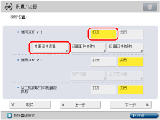 按<使用SNMP v.1>的[打开]→[专用团体设置]。为<专用团体>按[打开]→<MIB访问权限>按[读取/写入]。