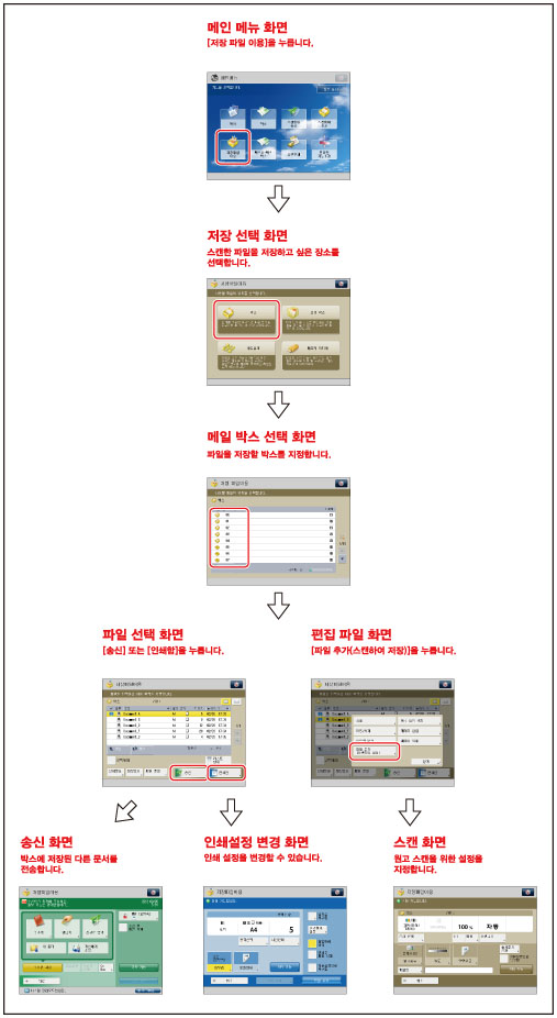 [파일 추가 (스캔하여 저장)]와 관련된 절차 및 스캔 화면에서 조작에 대한 사항은 "파일 추가(스캔하여 저장)" 및 "스캔하여 저장 조작 순서"를 참고하십시오.