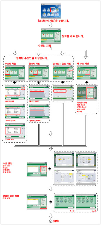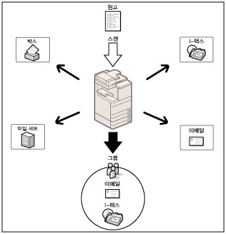 스캔한 문서를 이메일 주소, I-팩스 주소 또는 파일 서버로 송신하려면 네트워크 설정을 지정해야 합니다. ("이메일/I-팩스 공통 통신 설정" 참고)