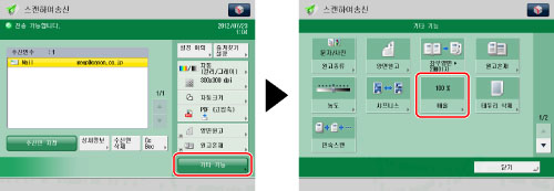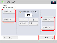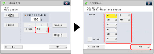 PDF(아웃라인), PDF(고압축), PDF(OCR), XPS(고압축), XPS(OCR) 또는 OOXML을 파일 형식으로 설정하면 [1:1 (100%)] 또는 [자동] 배율로만 송신할 수 있습니다.