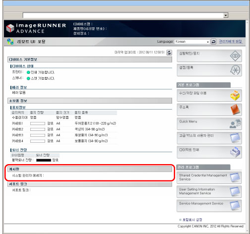 또는 리모트 UI의 포털 페이지에 표시될 메시지를 입력합니다. 한 줄당 23자까지 입력할 수 있고 4줄까지 메시지를 입력할 수 있습니다.