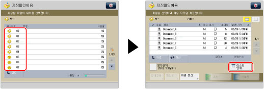 [명칭] 또는 [날짜/시각]을 눌러 저장된 파일 리스트를 정렬해도 파일 리스트는 파일이 박스에 저장된 순서대로 인쇄됩니다.