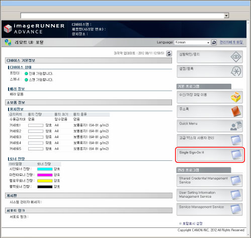 <http://<기기의 IP 주소 또는 호스트 이름>:8000/sso/>를 입력한 경우 3단계에서 리모트 UI 화면을 표시하지 않고 메인 메뉴가 표시됩니다.