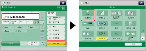 수신인을 지정하고 → [기타 기능]을 누른 다음 → [원고 종류]를 누릅니다.