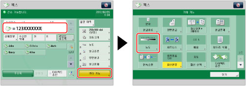 수신인을 지정하고 → [기타 기능]을 누른 다음 → [농도]를 누릅니다.