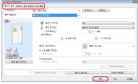 프린터 설정 화면에서 원하는 설정을 지정한 다음 → [확인]을 클릭합니다.