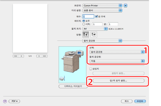 [용지 공급원] 환경 설정 창