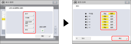 若將[確認紙張類型]設定為「開啟」,則原紙張來源中的紙張用盡時,不會從其他紙張來源送紙,除非其他紙張來源中裝有相同尺寸和類型的紙張。有關已儲存紙張類型的詳細資訊,請參閱「檢查消耗品的狀態和其他資訊」。
