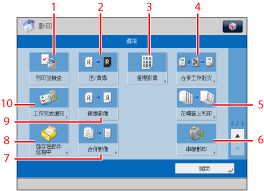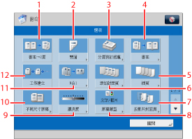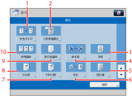 顯示後一螢幕或前一螢幕。這些螢幕顯示所有特殊影印模式。