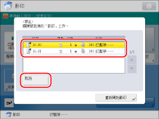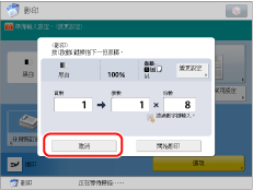 若在本機器正在影印或等候影印時出現的快顯螢幕上按[取消],則可以取消正在影印的工作或等待影印的已掃描原稿的最後一份工作。