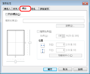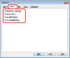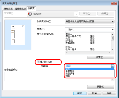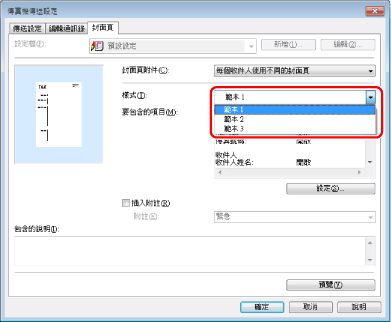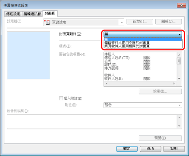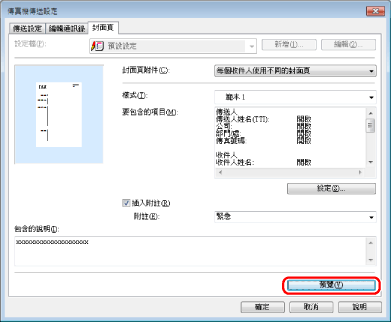 在[傳送設定]標籤中所指定的目的地資訊列印在封面頁中。