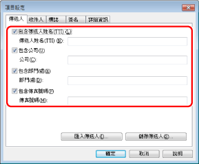 透過按一下[儲存傳送人]可將在[傳送人]標籤中所輸入的資訊儲存為檔案。以後傳送傳真時,您可以透過[匯入傳送人]將其資訊匯入,無需在每次傳送傳真時都重新輸入傳送者資訊。