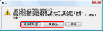 若在步驟3所選的資料夾中已有一個通訊錄,則顯示如下訊息。如您需要使用已有的通訊錄,按一下[直接使用],若您需要使用傳真驅動程式中的通訊錄,按一下[覆蓋]。