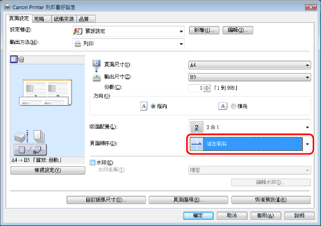 若無法選擇[版面配置]的選項,請顯示[裝置設定]頁,然後從[在主機多工緩衝處理]選擇[自動]或[啟用]。有關如何顯示[裝置設定]頁的說明,請參閱「設定印表機選項」。