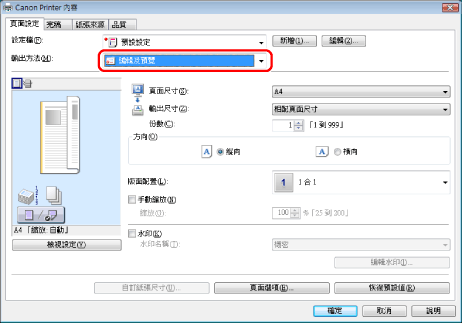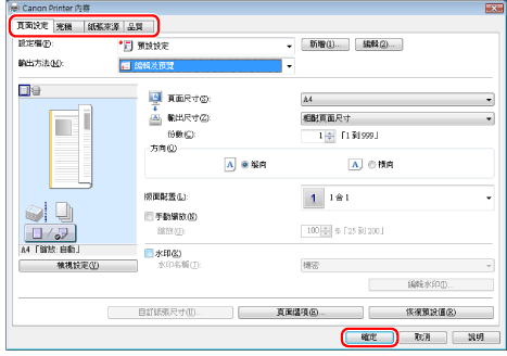 按一下[頁面設定]、[完稿]、[紙張來源]和[品質]頁,然後指定所需的項目。
