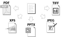 可以傳送多種檔案格式的文件,包括PDF、XPS、OOXML(pptx)、JPEG和TIFF。這樣,使用者可以根據文件用途和接收者的文件操作環境自由選擇最適合的文件傳送方式。