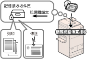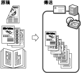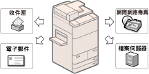 本機器提供多種方便的掃描功能,例如雙面原稿掃描和書本原稿掃描,也可以將分開掃描的文件合併並傳送。也可以根據所掃描原稿的類型設定適當的曝光、色彩模式和掃描尺寸。此外,可以儲存優先掃描設定並可以隨時恢復。