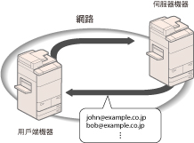 本機器可以作為用戶端機器存取網路上的伺服器機器以其「通訊錄」搜尋/指定接收者。