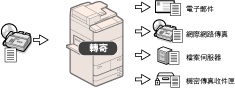 可以設定為使用所需傳送設定自動將符合指定轉寄條件的已接收網際網路傳真文件轉寄至任何接收者。可以將接收的網際網路傳真文件轉寄至其他機器(中繼功能),或將其儲存在「機密傳真收件匣」中。也可以將自動轉寄設定為在指定時間啟用。由於不符合轉寄條件的已接收文件也可以轉寄至任何所需接收者,因此可以用該功能將已接收網際網路傳真文件分類,並傳送給合適的接收者。