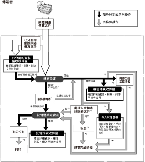 *1 若在[轉寄設定]中將<儲存/列印已接收檔案>設定為「開啟」,則會列印已轉寄文件,或將其儲存在「記憶接收收件匣」中。