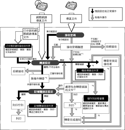 *2 若在[轉寄設定]中將<儲存/列印已接收檔案>設定為「開啟」, 則會列印已轉寄檔案,或將其儲存在「記憶接收收件匣」中。有關「儲存/列印已接收檔案」的詳細資訊,請參閱