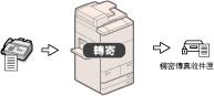 可以將本機器設定為使用所需傳送設定自動將符合指定轉寄條件的已接收傳真文件轉寄至任何接收者。也可以將已接收的傳真文件轉寄至其他機器(中繼功能),或將收到的機密文件自動儲存在「機密傳真收件匣」中。也可以將自動轉寄設定為在指定時間啟用。由於不符合轉寄條件的已接收文件也可以轉寄至所需接收者,因此可以用該功能將已接收傳真文件分類,並傳送給合適的接收者。