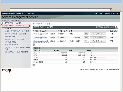 アプリケーションが使用しているハードディスク領域は、[MEAPアプリケーション管理]ページに表示される資源情報の「ストレージ」で確認できます。