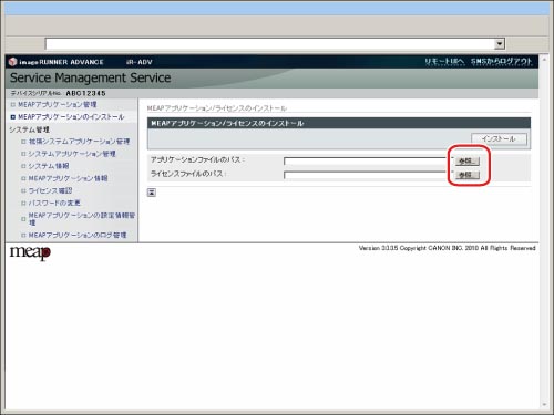 ライセンス管理システムにアクセス後、画面に表示される指示に従ってライセンスファイルを取得してください。ライセンスファイルを取得するには、ライセンスアクセス番号およびデバイスシリアル番号(SMS画面上の左上に表示される番号)が必要です。
