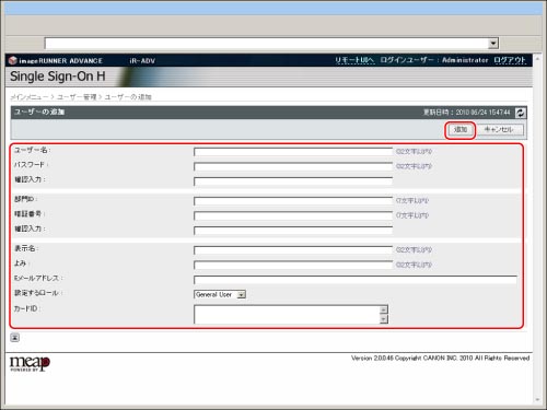 [設定するロール]で[Administrator]を選択すると、そのユーザー名とパスワードでローカルデバイス認証のユーザー登録/編集画面にログインできるようになります。