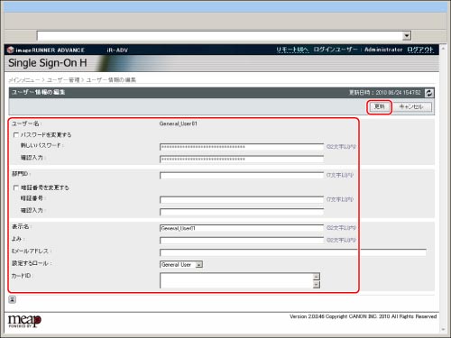[ユーザー管理]ページでユーザー情報を登録/編集できるのは、ローカルデバイス認証の管理者のみです。一般ユーザーは、自分自身のパスワードのみ変更できます。