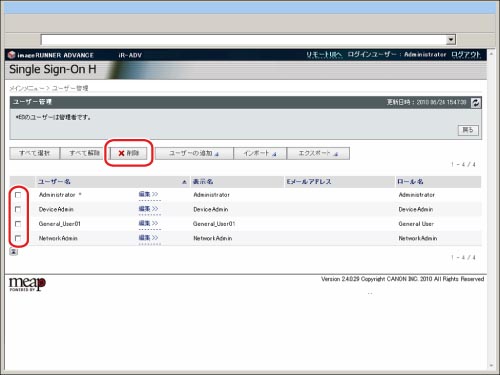 システムアドミニストレーター(Administrator)としてログインしているユーザー情報は削除できません。