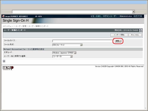 NetSpot Accountant 4.x/imageWARE Accounting Manager専用のフォーマットで作成されたユーザー情報をインポートします。ファイルの拡張子は「csv」です。