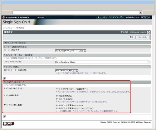 [デバイスが所属するサイトのみ]が設定されていても、本体の起動時にドメインコントローラーにアクセスを行う場合は、本体が所属するサイト以外へもアクセスが行われることがあります。その場合、通常はサイト内のドメインコントローラーに対してのアクセスが優先されます。例外として、サイト内のドメインコントローラーにアクセスできず、サイト外のドメインコントローラーにアクセスできた場合はサイト外のドメインコントローラーへのアクセスが優先されます。