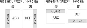 両面プリントの場合は、「とじ方向」の設定に応じて裏面のプリントの向きが異なります。