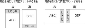 とじる位置を、用紙の長い辺にするか短い辺にするかを設定します。両面プリントをしてとじるときには、表面と裏面とで、とじしろの位置が自動的に調整されます。