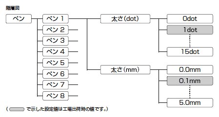 ただし、0.0mmを設定すると解像度に関係なく0.1mmの太さになります。0dotを設定すると解像度に関係なく1dotの太さになります。