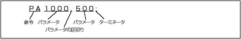 たとえば、「PA」の後ろには座標を示す2つのパラメータが必要になります。パラメータが複数の場合は、パラメータの間に「,」をつけてパラメータを区切ります。